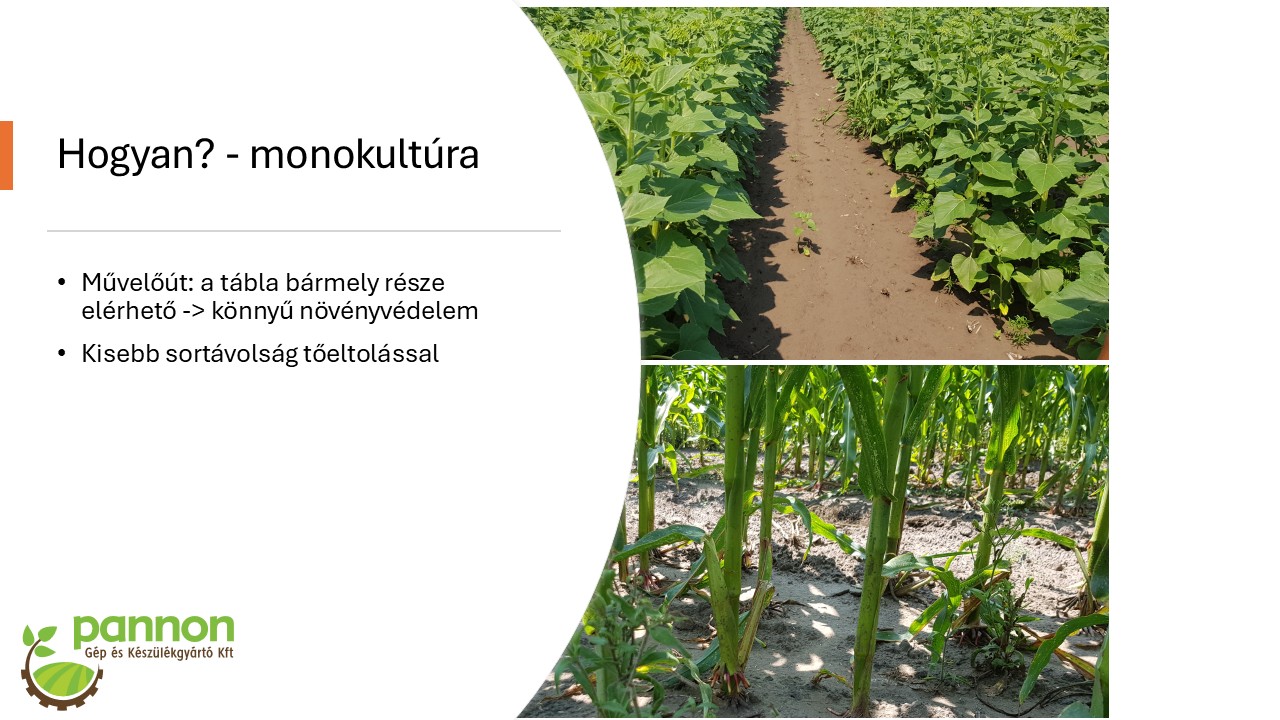 Itt érkeztünk el egy lényeges kérdéshez, hogy milyen termesztési megoldást válasszunk a növénykultúránk minél eredményesebb vetéséhez? A most bemutatandó példák egy kb. 40 hektáros terület vetéséből lettek kiemelve, ahol a különböző vetési lehetőségeket vizsgáltuk az erre a célra fejlesztett vetőgépünkkel. Főleg a nagyobb területeken elterjedtebb a monokultúrás növénytermesztés. A megszokott alkalmazási módoktól eltérően lehet nem zárt táblákban, hanem művelőutak kialakításával, a növényeknek szellőzést, a gazdának a tábla egészére betekintési lehetőséget biztosítva. A művelőutakon történő megfelelő talajmunkával a vízháztartást is javíthatjuk. A művelőutak kialakításával viszont értékes területeket veszíthetünk, lecsökkentve az adott területre eső tőszámot. Ennek kivédésére alkalmazhatjuk az egymás melletti sorok esetén a tőeltolásos vetést, ahol is a megfelelő precizitású vetőgép alkalmazásával a sorokat közelebb lehet hozni egymáshoz, a megfelelő tőtávolság megtartásával. Az alsó képen látható kukorica vetése ezzel a módszerrel történt. Ennek eredményeként a tőszám valamelyest csökkent ugyan, de a művelőutas és a tőeltolásos vetés együttes alkalmazásának eredményeként a hozam megegyezett ugyanakkora, zárt táblás művelésű terület hozamával, valamint ebben a kísérleti táblában termesztett növények jobb aszálytűrő képességgel rendelkeztek. Ezeket a vetési módokat is megvalósíthatjuk a Pannon Gép kft. vetőgép típusaival, hogyha monokultúrás művelést választunk.
