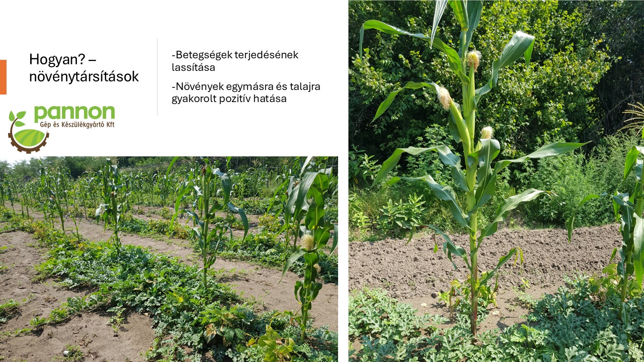 Választhatjuk a környezetre kisebb hatást gyakorló növénytársításos vetést is, hiszen a növények egymásra hatása kedvezőleg hat a termés mennyiségére és minőségére, továbbá egyes társítások akadályozzák a betegségek terjedését, csökkentve ezzel a vegyszerek alkalmazásának szükségességét. A képen egy klasszikus társítást láthatunk, csemegekukorica, dinnye, bab. Látható a képen, hogy a kukorica 3 egészséges csövet nevelt, a dinnye jól érzi magát a bab és a kukorica időszakos árnyékában, közben megakadályozza a bab és a kukorica tövének túlmelegedését, a talaj kiszáradását lassítja. A képen látható társítás vetését egy 3 soros vetőgépünk alkalmazásával, egy menetben végeztük. Az egyik tag a kukoricát, egy másik a dinnyét, a harmadik pedig a babot vetette, különböző tőtávolságokkal. A különféle termesztési módszereket hogyan lehet megfelelő szabadságfokkal kiválasztani, akár a vetés előtti utolsó pillanatban a korábban felvázolt tényezők figyelembevételével?