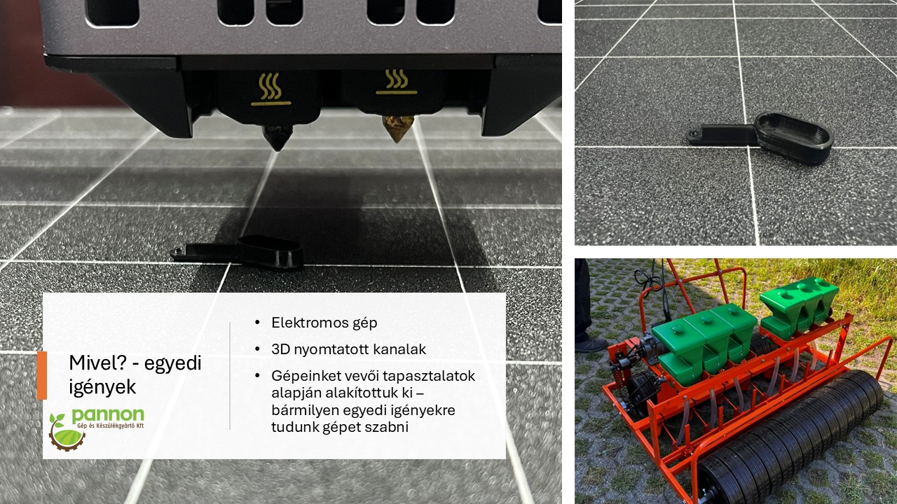 Azonban, ha ez még nem volna elegendő, a szabad gazdálkodói fantázia kihasználásához, kérésre bármilyen egyedi gépet kialakítunk és a sikeres gazdálkodás érdekében bármely géphez egyedi tartozékokat is készítünk. A képen látható elektromos hajtású vetőgép egyedi megrendelésre készült, kisebb területre, alakor búza vetésére, melyhez speciális vetőkanalat is készítettünk 3D nyomtatásos technológiával.